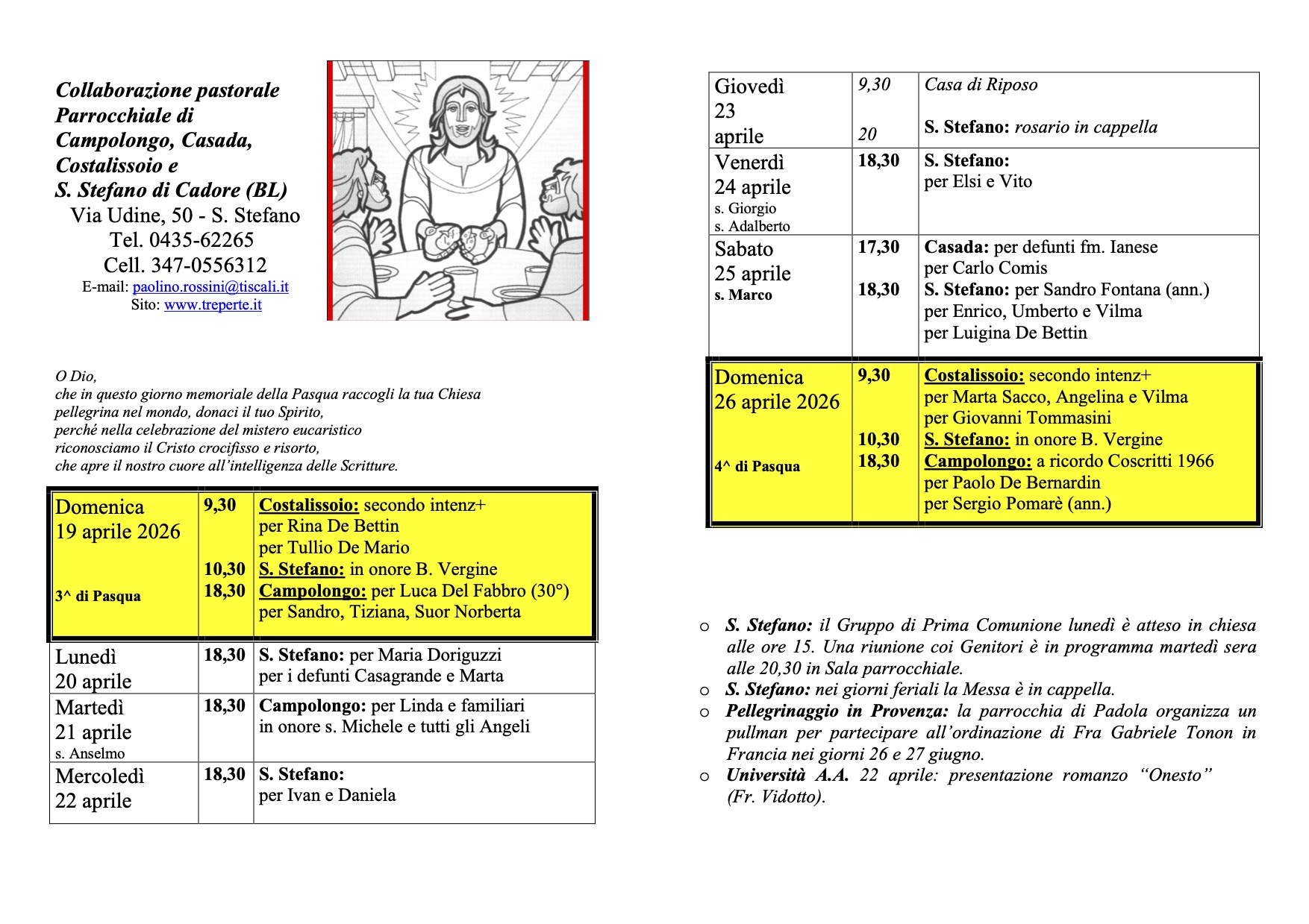Avvisi per la settimana dal 19 al 26 aprile: