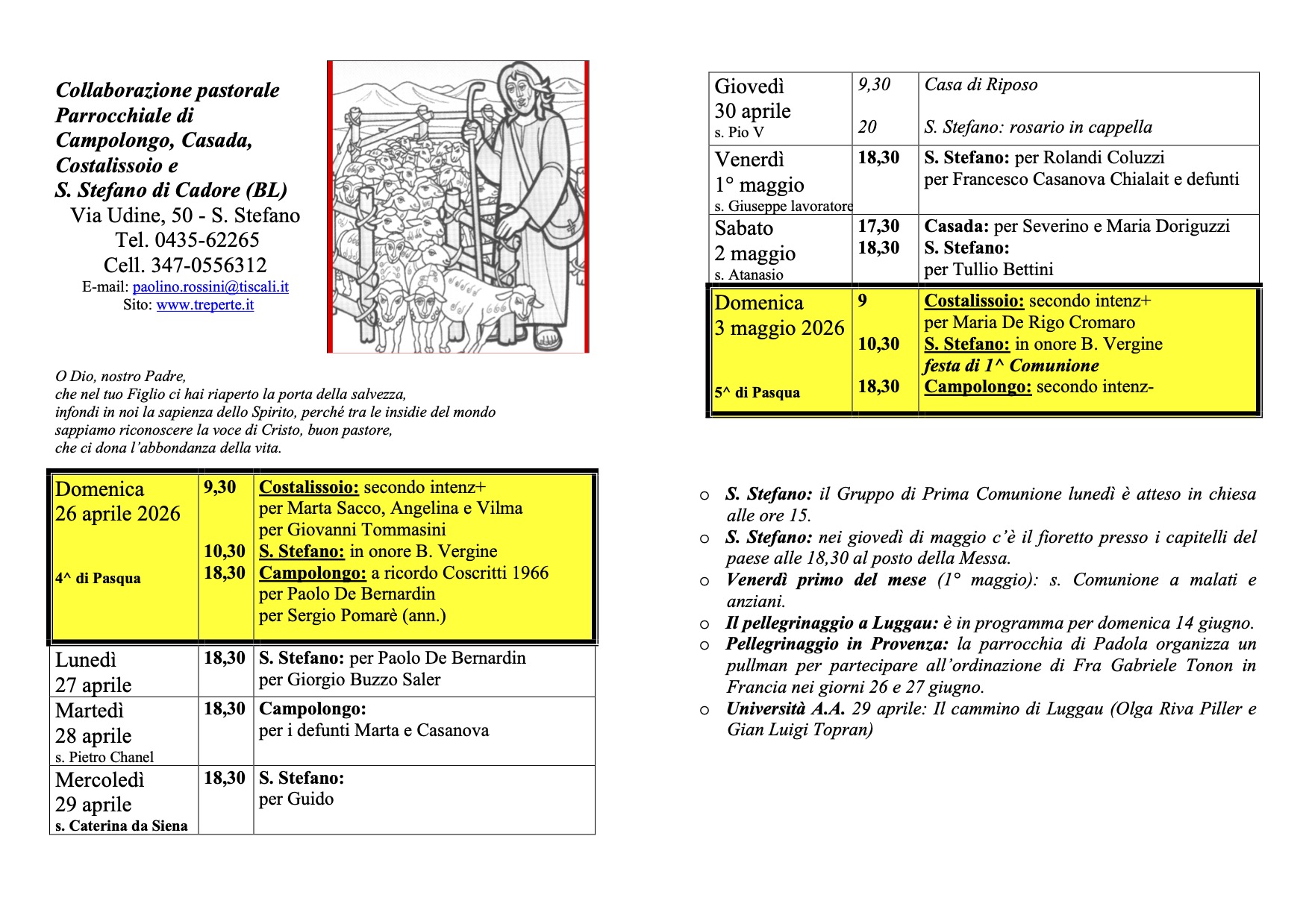 Avvisi per la settimana dal 26 aprile al 3 maggio: