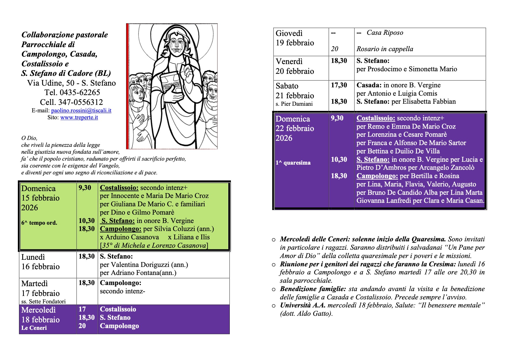 Avvisi per la settimana dal 13 al 20 febbraio: