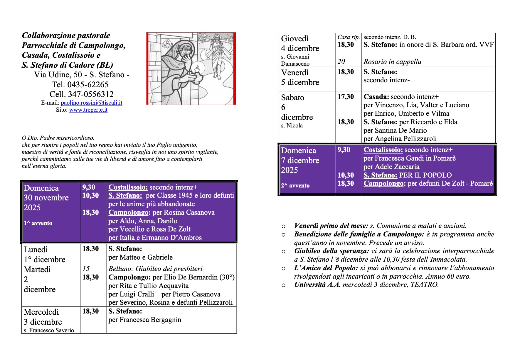 Avvisi per la settimana dal 30 novembre al 7 dicembre: