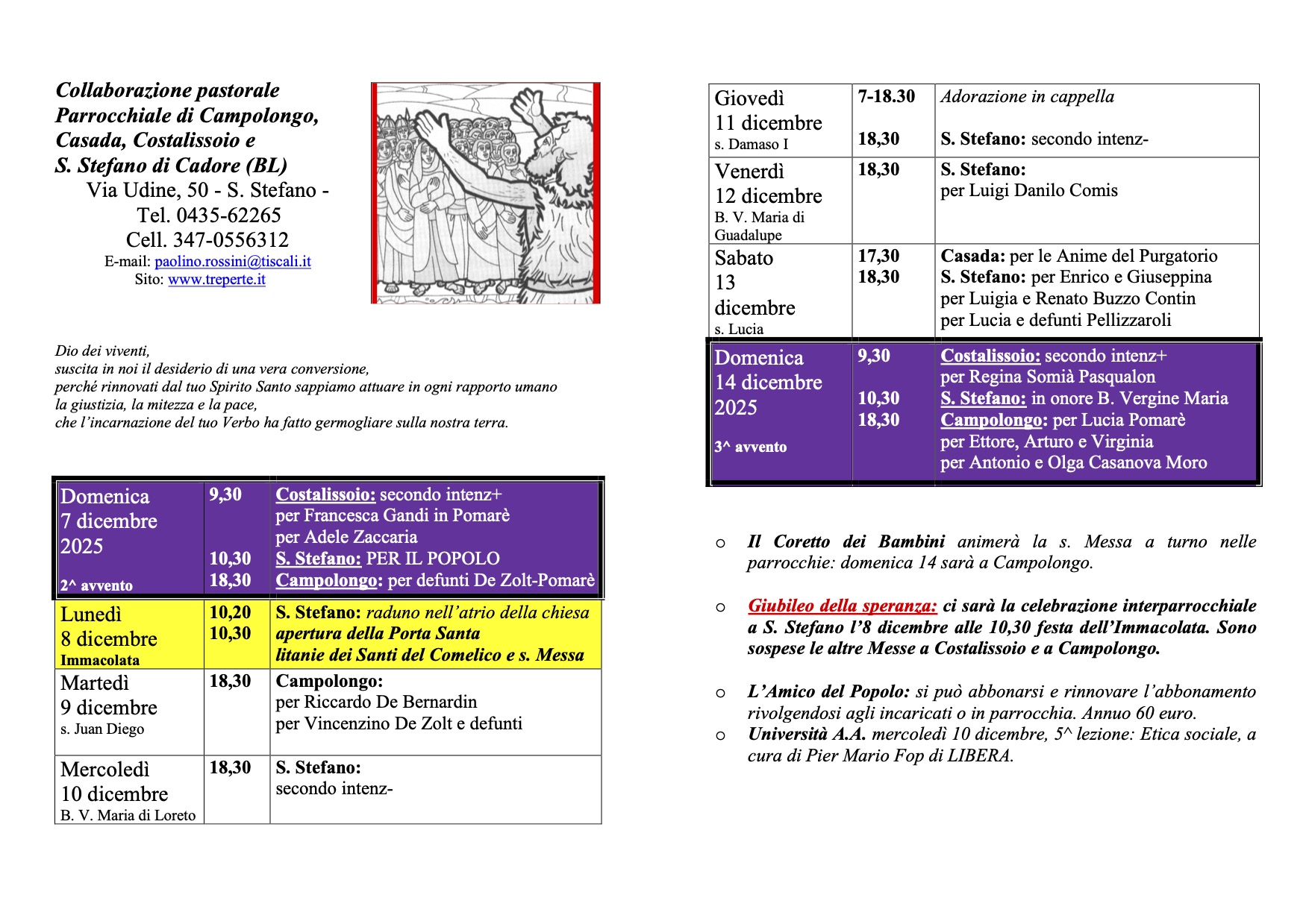 Avvisi per la settimana dal 12 al 19 dicembre: